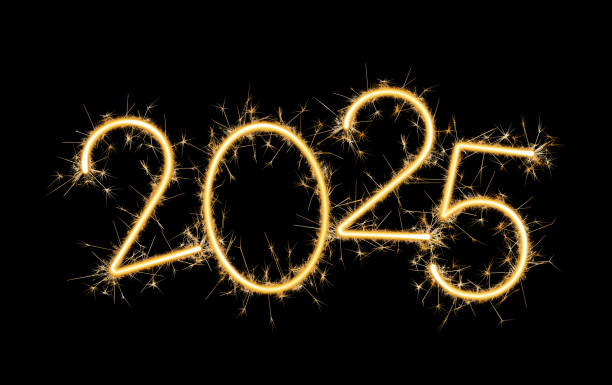 2025 sparkler fireworks number logo isolated on black background. 2025 New Year vector icon for greeting card, poster, banner, flier